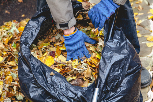 Hands lay fallen leaves in large bag