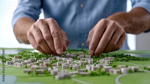 Hands manipulating an architectural model, showcasing urban planning and design concepts on a green surface, representing development and creativity.