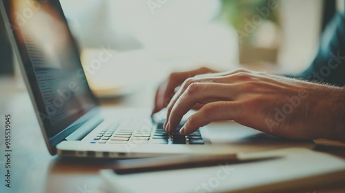 Hands move rapidly over a laptop keyboard in a contemporary office setting, with a notebook and stationary nearby, emphasizing productivity and focus on tasks