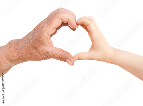 Hands of a child and an elderly person forming a heart symbol. Concept of love, care, family, and unity across generations.