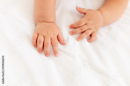 hands of a small baby on a white cotton bed at home, small fingers of a child close-up