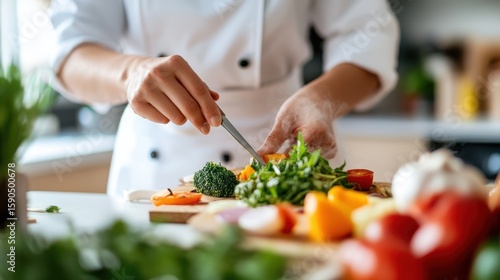 Hands of a woman chef preparing fresh vegetables in a minimal kitchen