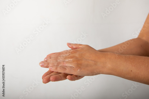 hands of a woman with liquid from a desinfectant.