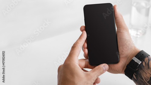 Hands of adult european guy checks social networks, app and chatting online in smartphone with empty screen
