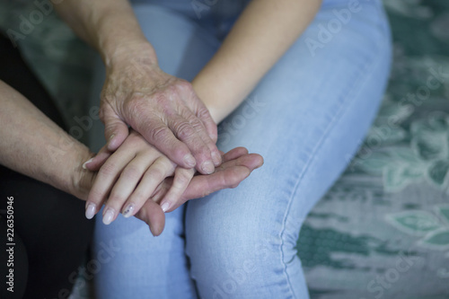 Hands of an elderly woman holding the hand of a younger woman.