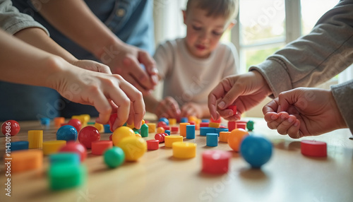 Hands of children and adults playing with colorful building blocks on a wooden table during creative time