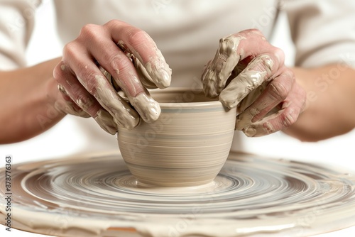 Hands of girl creating bowl on potter's wheel.