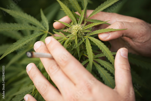 Hands of man touching and examining marijuana plant