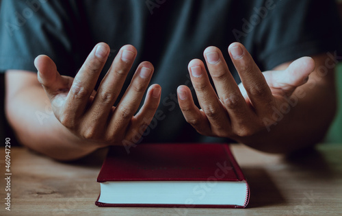 Hands of man with Bible praying.Christian life prayer to god. Man Pray for god.believe in goodness. Holding hands in prayer on a wooden table.