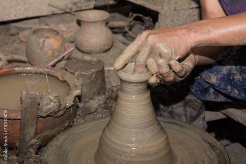 Hands of Professional Thai man using mechanic pottery made earthenware at "Koh Kret" in Thailand