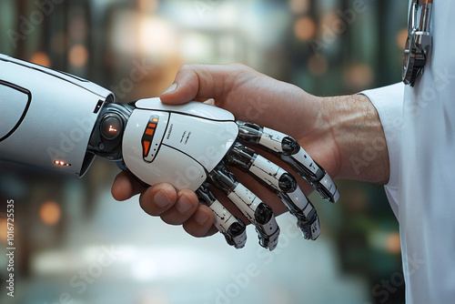 Hands of robot and human, global network connection. Cooperation between people and machine technology concept. AI technology development and global robotic science.