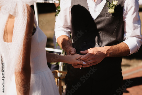 hands of the bride and groom hold together on the wedding day during the festive ceremony