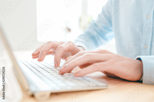 Hands of young analyst or designer typing by table in front of computer