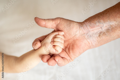hands of young great-grandson and old great-grandmother. Happy Family concept. Beautiful conceptual image of Maternity. selective focus