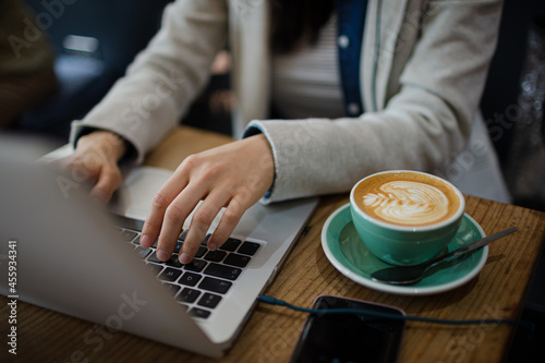 Hands of young woman using laptop, drinking cappuccino in cafe