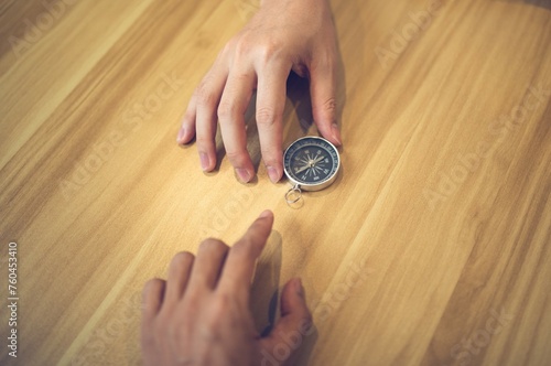 Hands on a wooden surface guiding a compass, symbolizing direction, exploration, and navigation