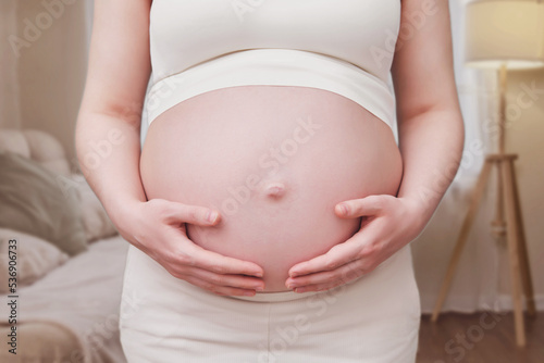 Hands on the tummy of a pregnant woman, home living room
