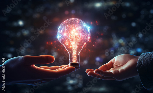 Hands pass a holographic thought or idea in the form of a virtual light bulb. AI, Machine learning. Science and artificial intelligence technology. Innovation and futuristic science.