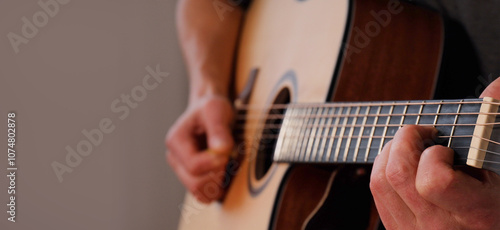 Hands playing acoustic guitar. Guitar music as form of self-expression creating personal and unique sound. solo guitarist plays at home capturing essence of relaxation and creativity. Banner