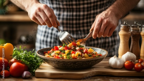 Hands preparing a colorful salad in a bowl, surrounded by fresh vegetables and a rustic kitchen backdrop.