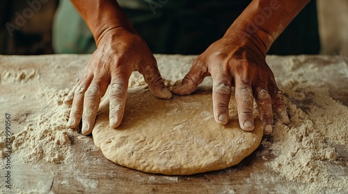 Hands Preparing Dough on Rustic Wooden Surface with Flour Dust