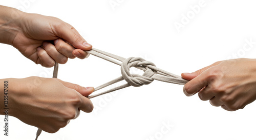 Hands pulling a tight knot with a white rope against a white background