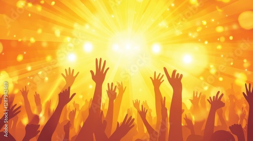 Hands raised in excitement as bright yellow lights illuminate a festival stage, energetic atmosphere.