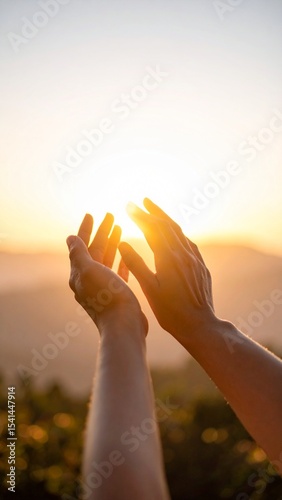 Hands Reaching for Sunrise Golden Light Wellness Concept.