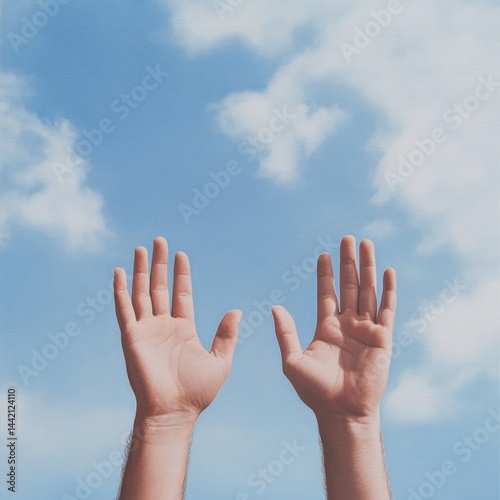 Hands reaching toward blue sky