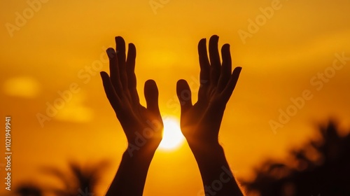 Hands reaching toward the sky, silhouetted against the backdrop of a golden sunset. generative ai