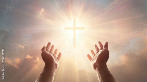 Hands Reaching Up Toward Bright Sunlight with Cross in the Sky During Sunrise.