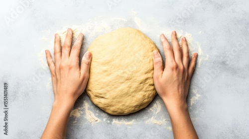 Hands shaping fresh dough on a floured surface ready for baking with natural light and soft shadows