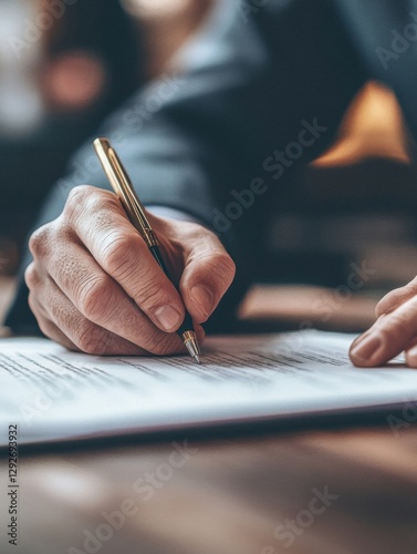 Hands signing important documents on a wooden surface in a well lit indoor setting. Generative AI