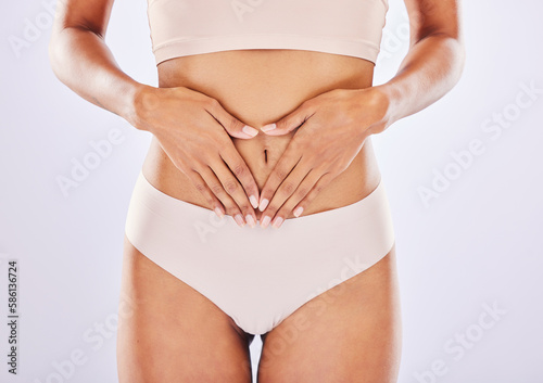 Hands, stomach and belly of a woman natural model with smooth skin isolated in a studio white background. Weight loss, diet and female touch abdomen for healthcare, fitness and nutrition