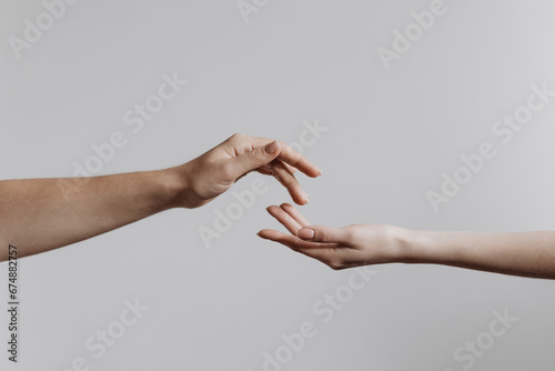 Hands touching each other isolated on grey background. Concept of human relation, community, togetherness, teamwork, love, symbolism, culture and history.