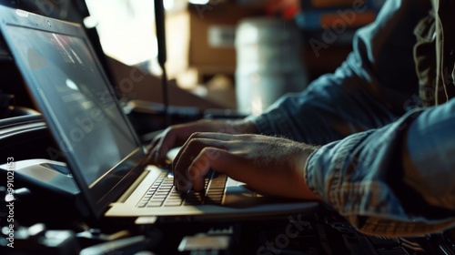 Hands typing on a laptop in a workshop setting, illustrating the convergence of traditional craftsmanship and digital technology in automotive diagnostics.