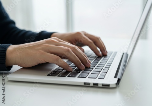 Hands typing on a laptop keyboard. Bright, clean background. Focused, productive, technological