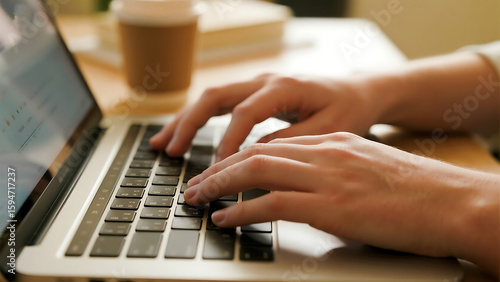 Hands typing on a laptop keyboard with a coffee cup nearby show remote work and online communication, reflecting modern lifestyle and productivity.