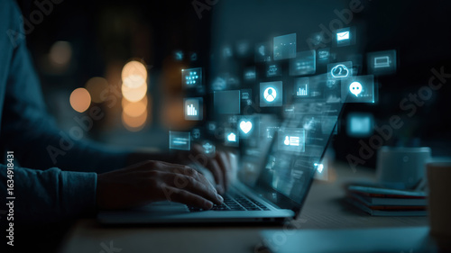 Hands Typing on Laptop with Holographic Icons - Programming and Digital Innovation Technology