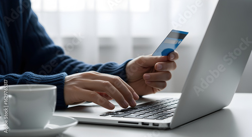 Hands Using Laptop Holding Credit Card with White Coffee Cup on Table in Soft Light Modern Interior Online Shopping and Banking Concept