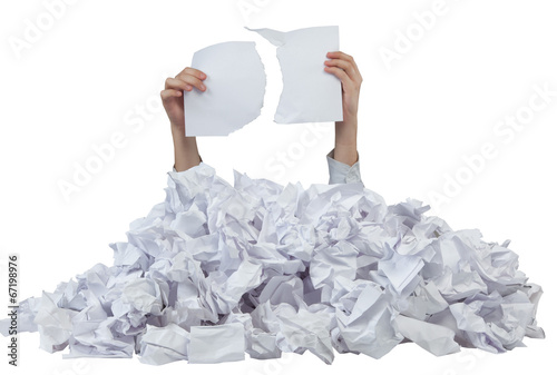 Hands with lacerated paper reaches out from crumpled papers