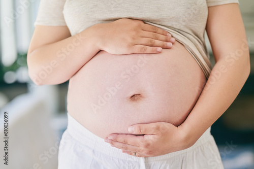 Hands, woman and pregnant stomach in home for love or excitement for parenthood, motherhood and waiting for baby arrival. Mother to be, living room and holding belly to feel kick on maternity leave.