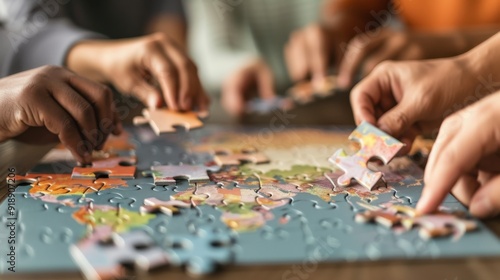 Hands working together to complete a colorful jigsaw puzzle, promoting teamwork and problem-solving skills in a cozy setting.