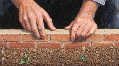 Hands working with soil and bricks, symbolizing gardening and nurturing plants.
