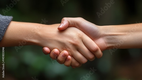 Handshake: A close-up shot of a firm handshake between two people, symbolizing agreement, partnership, and respect, set against a natural background.