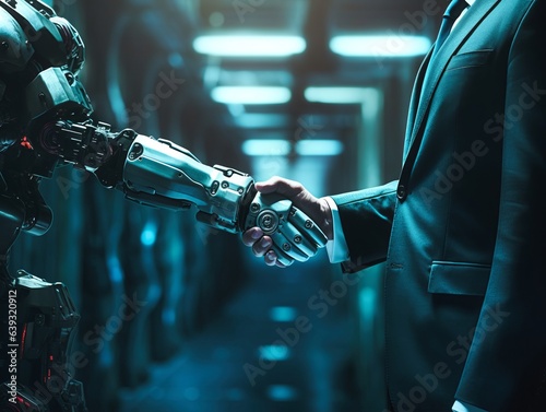 Handshake between a businessman and an AI robot. Deal-sealing amid a backdrop of corporate buildings.