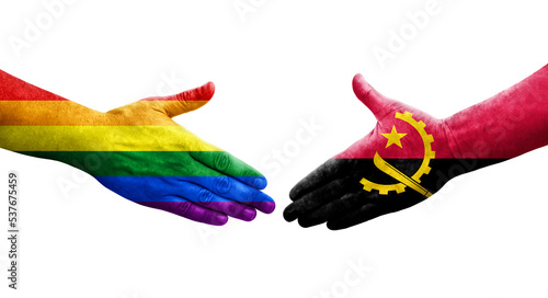 Handshake between Angola and LGBT flags painted on hands, isolated transparent image.
