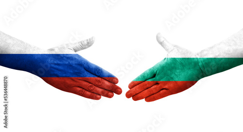 Handshake between Bulgaria and Russia flags painted on hands, isolated transparent image.