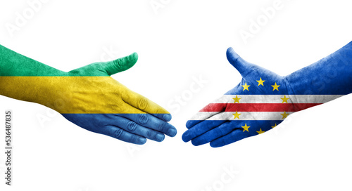 Handshake between Cape Verde and Gabon flags painted on hands, isolated transparent image.