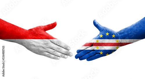 Handshake between Cape Verde and Indonesia flags painted on hands, isolated transparent image.